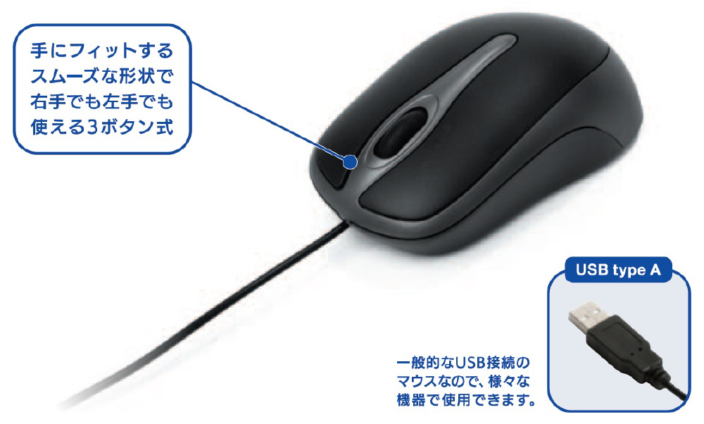 ■ 手にフィットするスムーズな形状で、左手でも右手でも使える3ボタン式マウス。