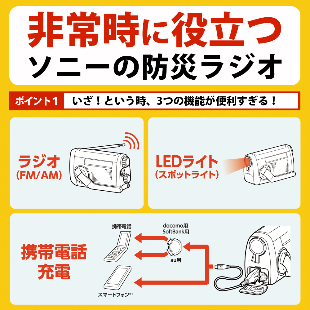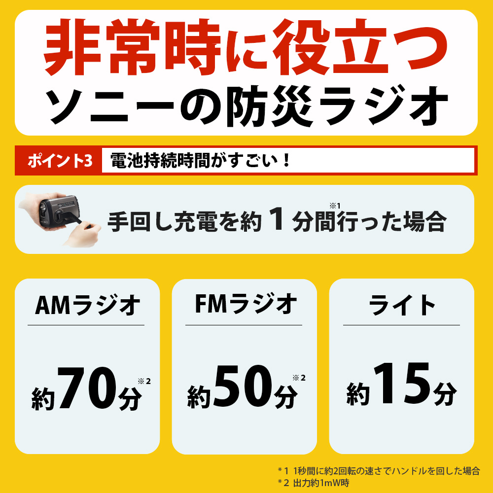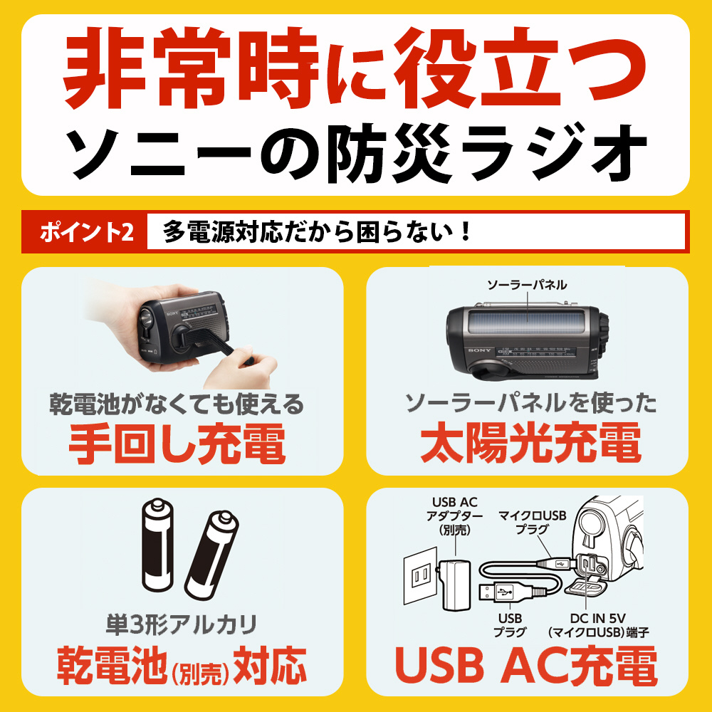 USB AC充電、太陽光充電にも対応した手回し充電ラジオ
