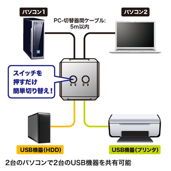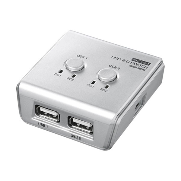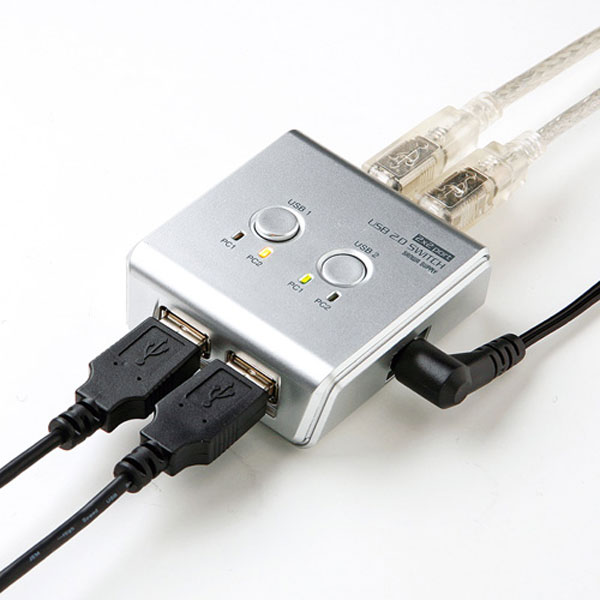 2台のパソコンで2台のUSB2.0機器をそれぞれ別々に切り替えて共有できるUSB2.0ハブ付き切替器。