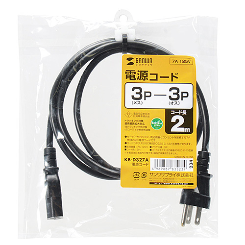 サーバーやパソコン、周辺機器とコンセントを接続する7A仕様の電源コード。3P・ブラック・2m。