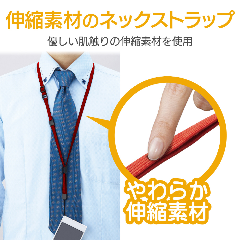 首に装着してスマートフォンの落下を防ぐ、伸縮素材を使用したネックストラップ。