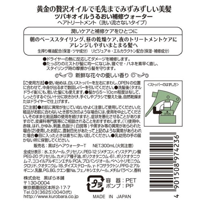 黄金の贅沢オイル 生搾り椿油配合で毛先までみずみずしい美髪へと導くウォータータイプのヘアトリートメント。潤いケアと補修ケアをひとつにまとめ、「乾燥から守る」「ツヤを与える」「補修する」「寝ぐせ・ハネを直す」効果で、アレンジしやすいまとまる髪に仕上げます。 新鮮な花々の優しい香り。