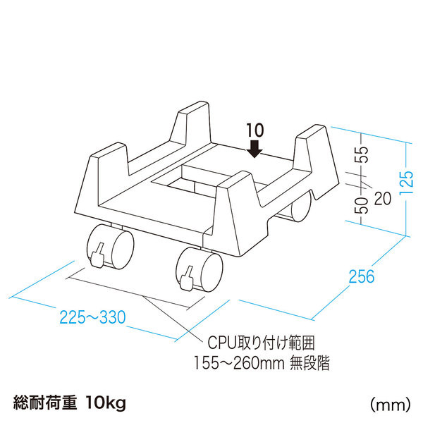 W155〜260mmの間で調節可能。キャスター付きでCPUのメンテナンスに便利。