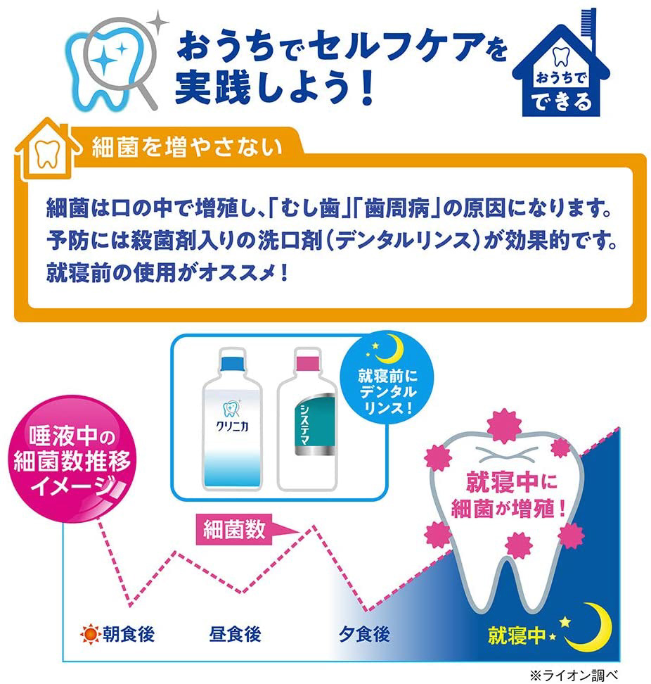 おやすみ前のご使用で、就寝中にリスクの高まるムシ歯/口臭/歯肉炎を予防し、翌朝のネバつきを防ぐ『ムシ歯予防デンタルリンス』。独自の「新・長時間殺菌処方(殺菌+抗菌コート)」で翌朝まで原因菌をよせつけず、増殖も抑制。◆ダブル殺菌成分に加え、コーティング剤として「グリセロリン酸カルシウム」を新配合。◆殺菌実感の高い「すっきりタイプ」。◇キシリトール(天然素材甘味剤)配合。◇メディカルハーブの香味