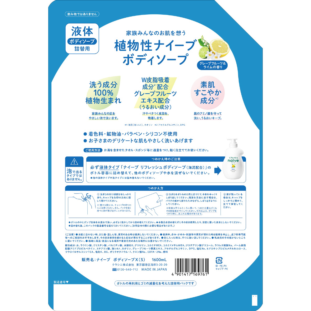 | 商品名 | 【数量限定】【naive(ナイーブ)】 リフレッシュボディソープ つめかえ用 海泥配合 1.6L |