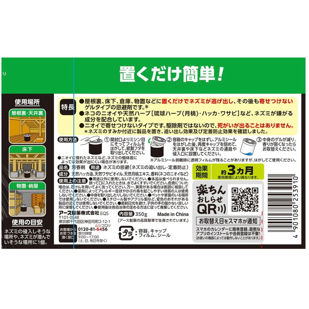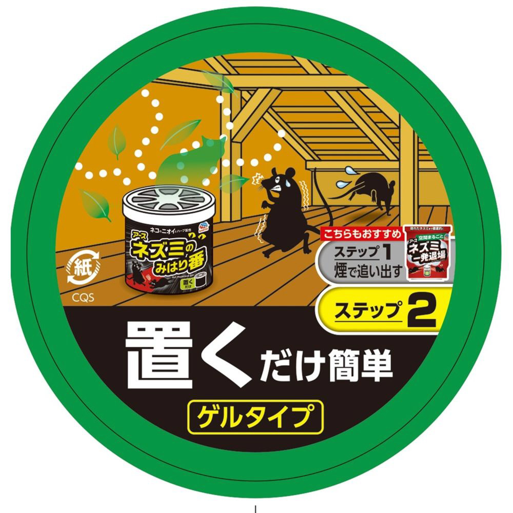 ハッカ・琉球ハーブ(月桃)・ワサビなどの天然ハーブやネコのニオイなど、ネズミが嫌がる成分とニオイを配合したゲルタイプの忌避剤です。