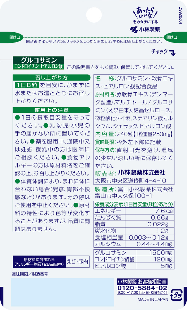 | 商品名 | 【小林製薬】グルコサミン・コンドロイチン・ヒアルロン酸(240粒) |