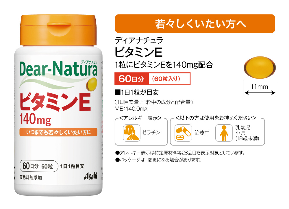 いつまでも若々しくいたい方に。抗酸化作用により体内の脂質を酸化から守るビタミンEが1粒で140mg摂取できます。