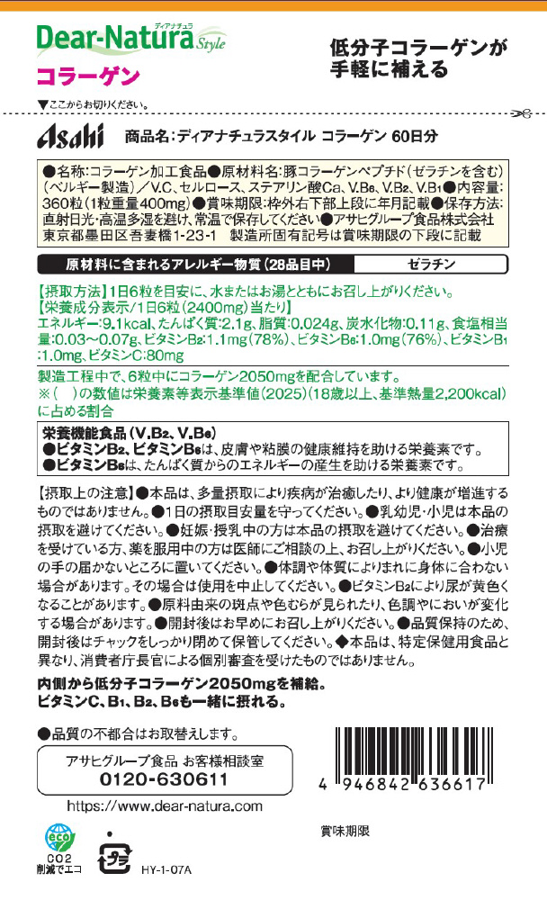| 仕様1 | 原材料名:豚コラーゲンペプチド(ゼラチン)、ビタミンC、でん粉グリコール酸Na、セルロース、ステアリン酸Ca、ビタミンB6、ビタミンB2、ビタミンB1 |