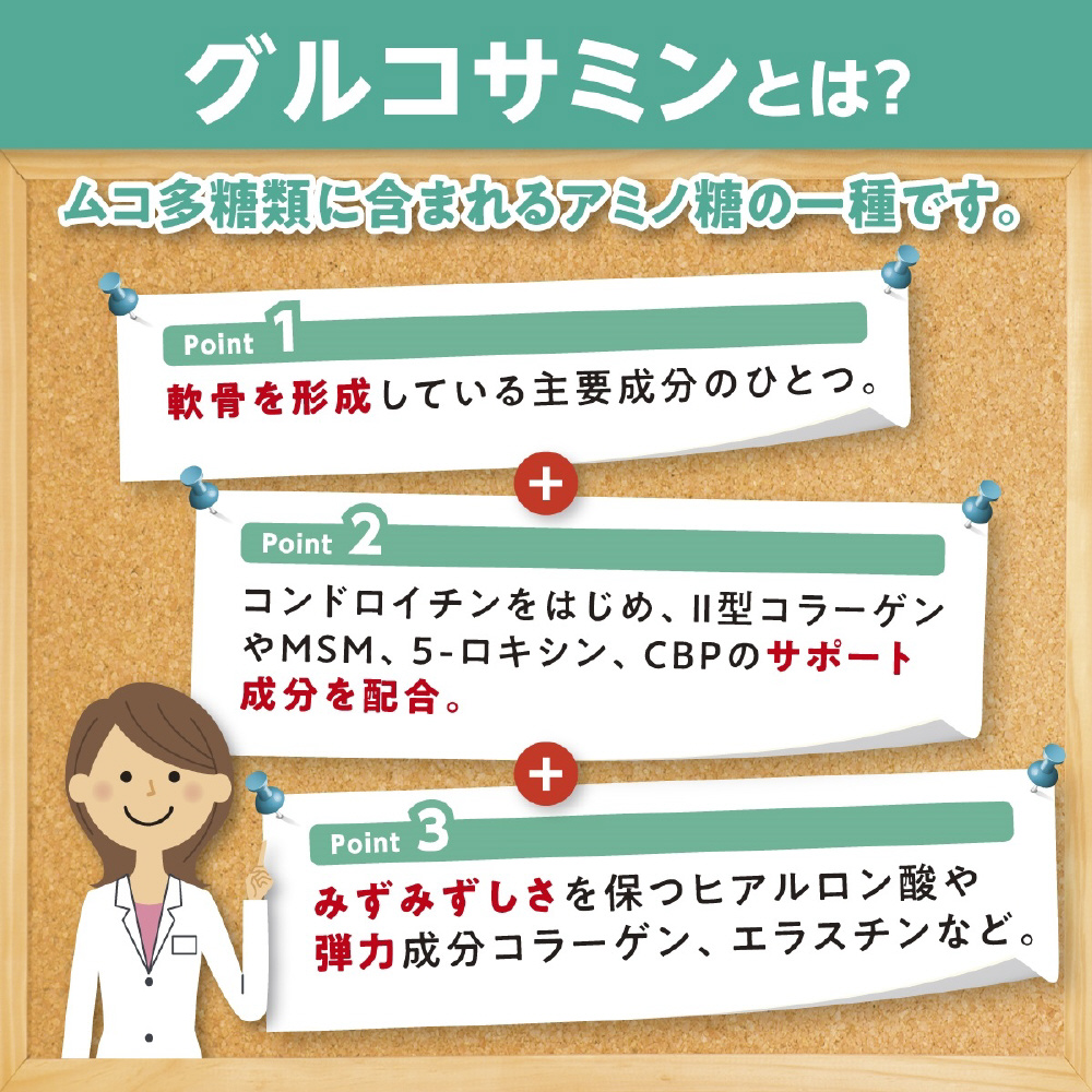 加齢とともに減少する重要成分グルコサミンやコンドロイチン、密度に関わるcbp(濃縮乳清活性たんぱく)をはじめ、らくな動きを助けるii型コラーゲンやmsm(メチルスルフォニルメタン)、ボスウェリアセラータエキスを配合し、スムーズな動きを多角的にバックアップ。