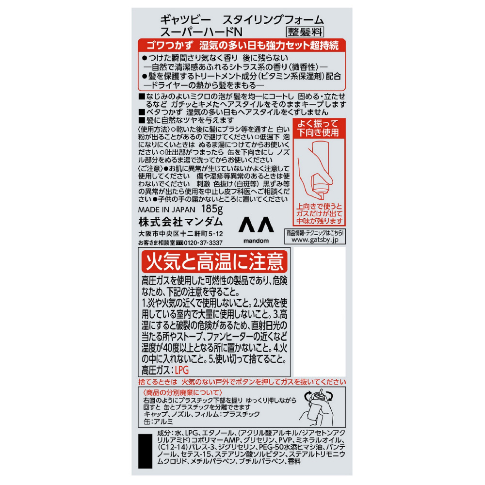 【GATSBY(ギャツビー)】スタイリングフォームスーパーハード(185g)〔スタイリングフォーム・ムース〕