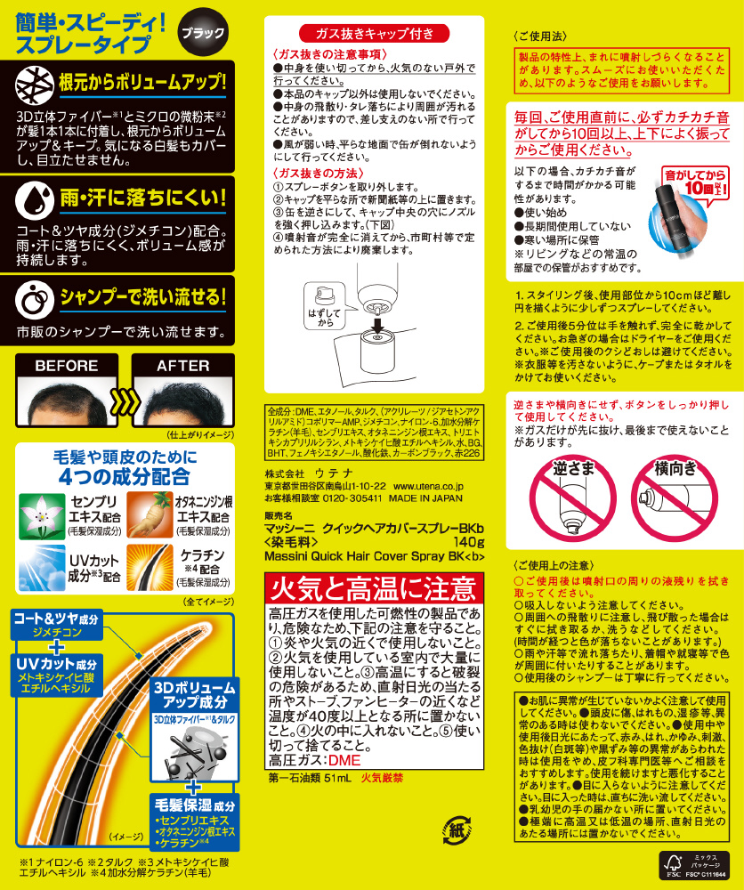 薄毛・細毛にスプレーするだけで、髪が増えてみえる増毛スプレー。ミクロの微粉末が髪1本1本に付着し、太くふんわりボリュームアップ。白髪も自然にカバーし、目立ちません。雨・汗に落ちにくく、ボリューム感が持続します。市販のシャンプーで簡単に洗い流せます。香りの残らない無香料タイプ。(ブラック)