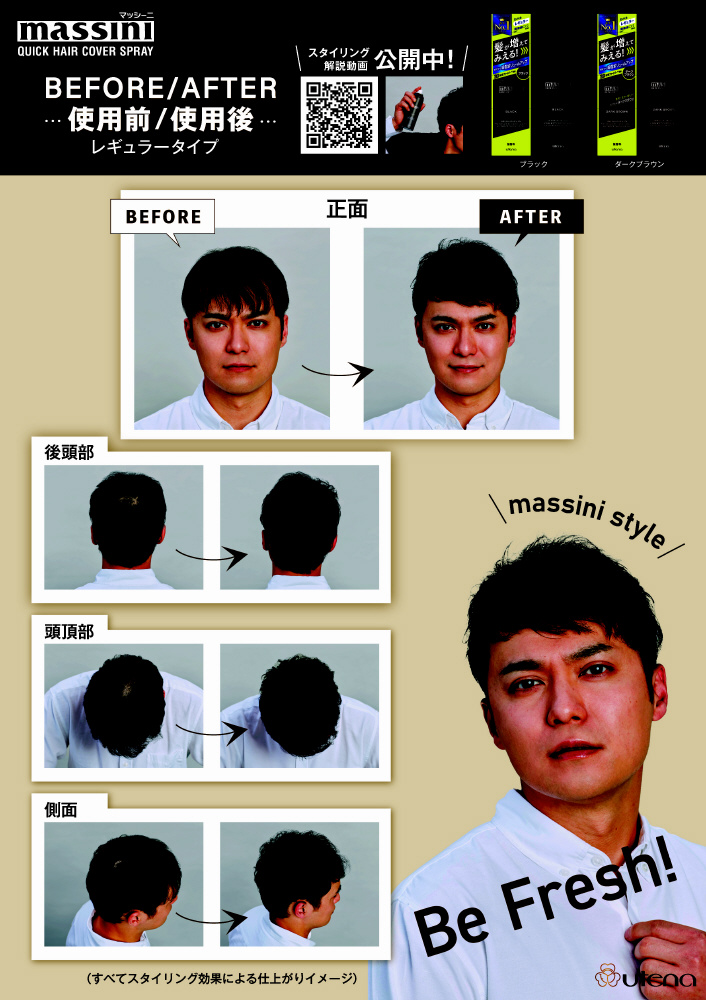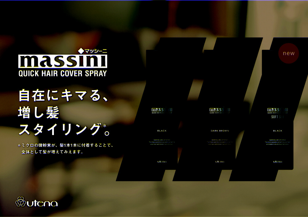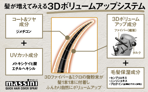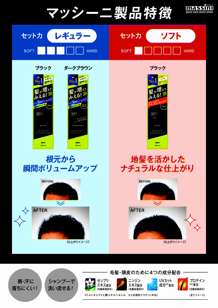 “薄毛にスプレーするだけで髪が増えてみえる”ヘアカバーシリーズ。雨・汗に強く、自然な仕上がりが持続します。