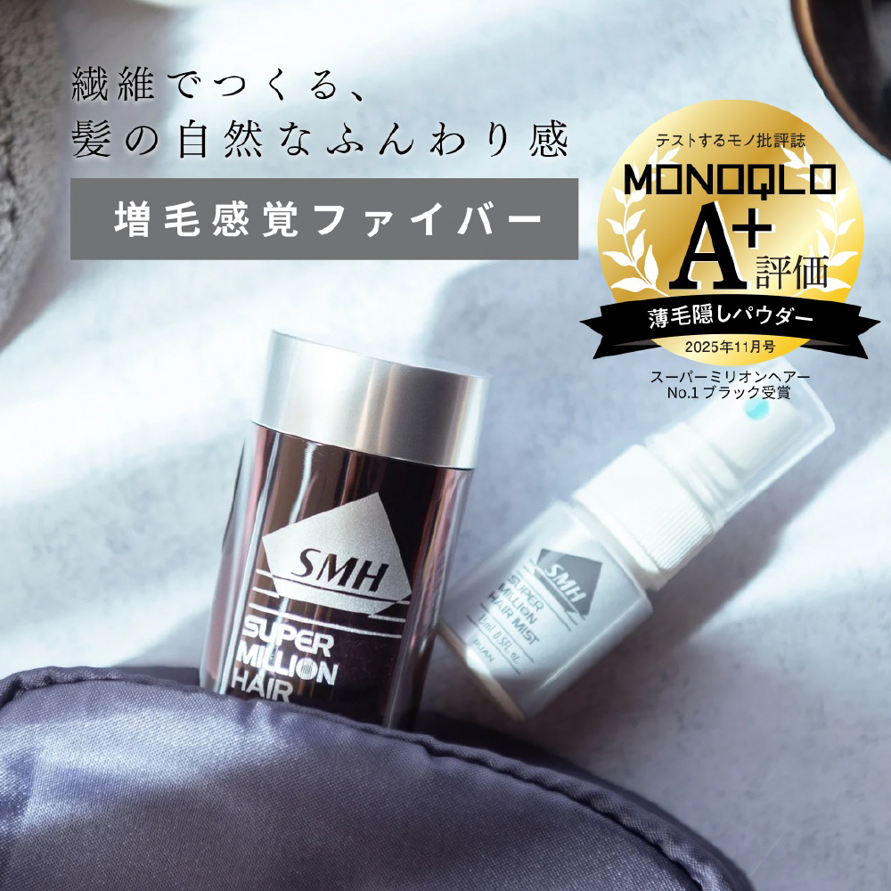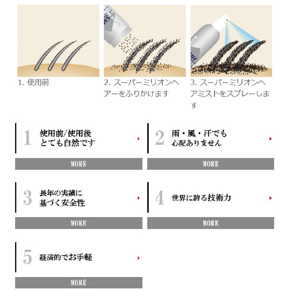 スーパーミリオンヘアーは、髪を生やすのではなく、瞬時に髪が生えたように見せる「新しいスタイルの増毛法」です。