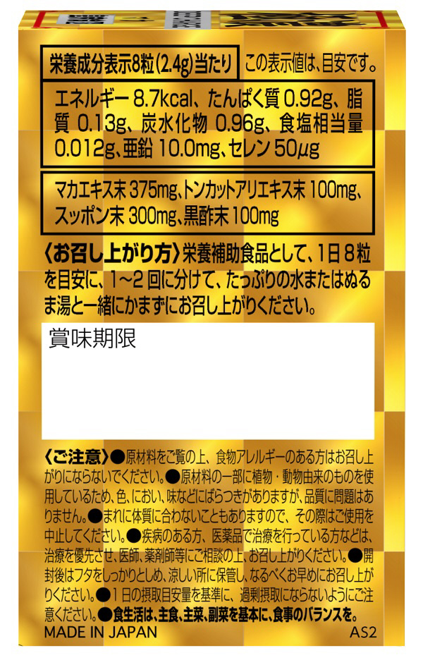 | 仕様2 | 原材料名@:マカエキス末、スッポン末、還元麦芽糖、トンカットアリエキス末、黒酢末、水素焼成サンゴ加工末、亜鉛含有酵母、L-シトルリン、セレン含有酵母、発酵黒ニンニク末、ブラックジンジャー抽出物、ローヤルゼリー末、冬蟲夏草末、霊芝末、豚睾丸エキス末、馬心臓末、サソリ末、トナカイ角末 |