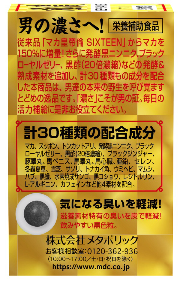 発売以来、多くのお客様に愛されてきたマカ皇帝倫シリーズの最上位版として、滋養成分独特の臭いにも配慮した、飲みやすくて使いやすい商品です。強く健康的なイメージの“熟成&醗酵”に注目し、男らしさ、強さを追求する動物植物由来の素材30種類を厳選して配合しています。仕事も遊びも全力に取り組む男性が手軽に摂取できる極濃タイプのマカサプリメントです。