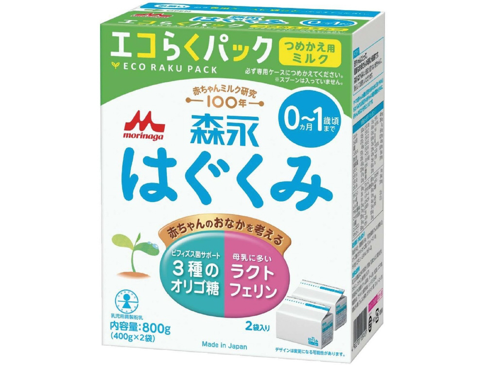 日本初の詰め替え用ミルク エコらくパック詰め替え用 はぐくみです。森永ドライミルクはぐくみは、栄養成分の量とバランスを母乳に近づけています。初乳に多いラクトフェリン入り。赤ちゃんの脳の発達に重要であるといわれている成分、アラキドン酸(ara)を新しく配合いたしました。