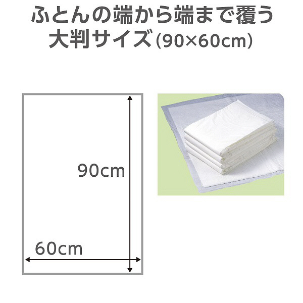 シーツを洗う手間のない使い捨てタイプです。一枚でふとんを覆い、万が一のモレもしっかり吸収。万が一の多量のモレにも安心のおしっこ3回分をしっかり吸収。サイズはふとんの端から端までを覆う幅90センチ、腰から太股まで届く長さ60センチ。