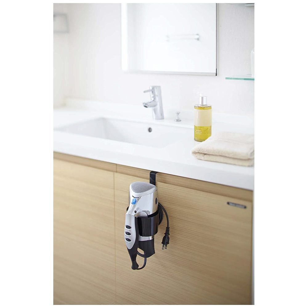 洗面台の扉に掛けるだけで、置き場所に困っていたドライヤーをスタイリッシュに収納できるドライヤーホルダーです。