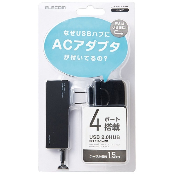 | 商品名 | USB2.0ハブ ACアダプター付〔4ポート・セルフ&バスパワー・Mac/Win〕ブラック U2H-AN4SBK |