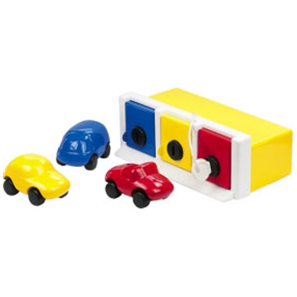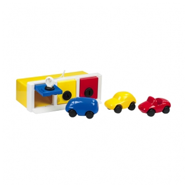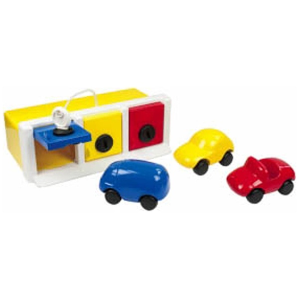 鍵の付いた扉に車を入れたり出したりできるガレージ