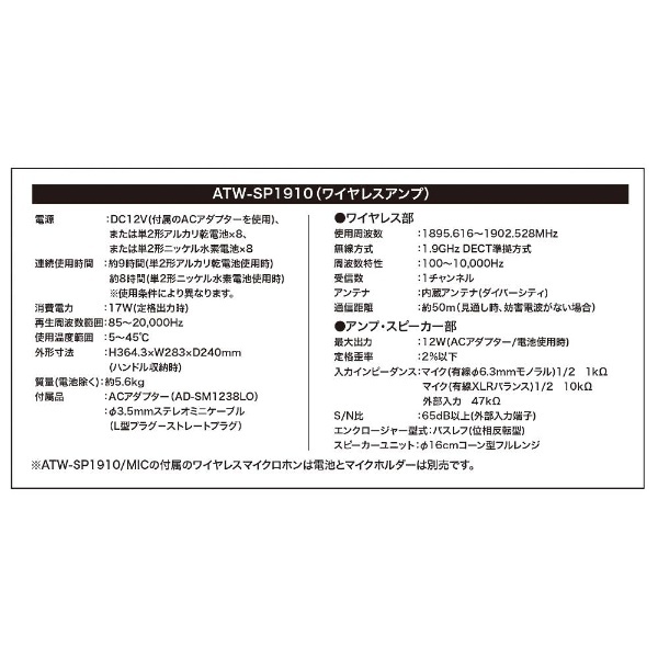 | 商品名 | デジタルワイヤレスアンプシステム(マイク別売り) ATW-SP1910 |