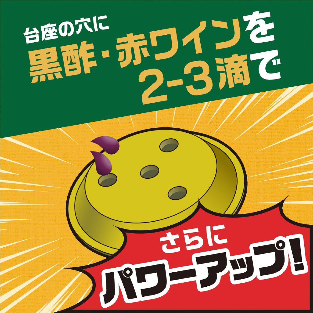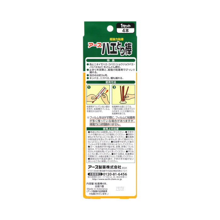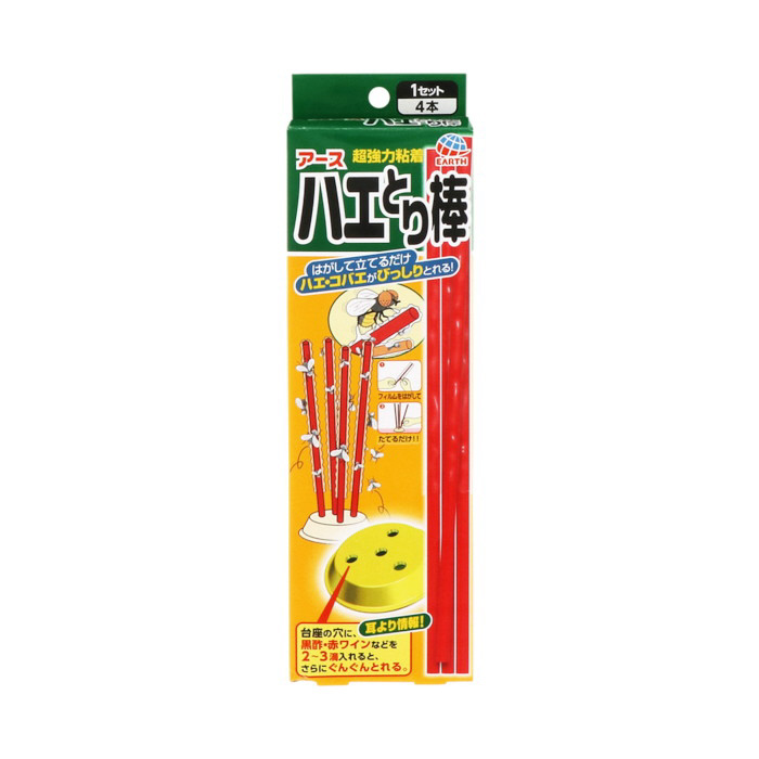 粘着棒の色と誘引効果でハエやコバエ(ショウジョウバエ・ノミバエなど)を誘い粘着捕獲。効果は約3ヵ月間持続。