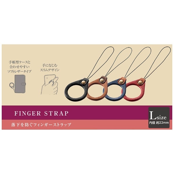 指に装着してスマートフォンの落下を防ぐ、フィンガーストラップです。手帳型ケースなどと合わせやすいソフトレザータイプです。