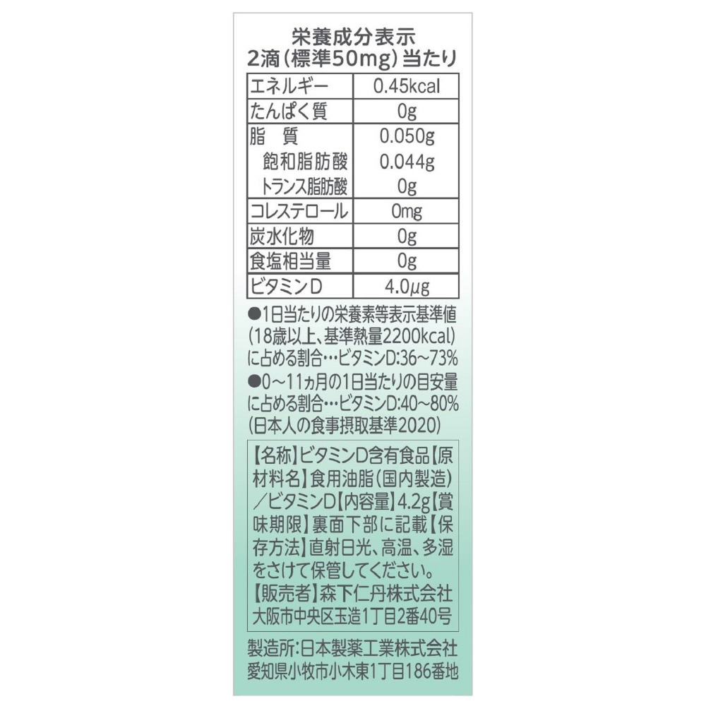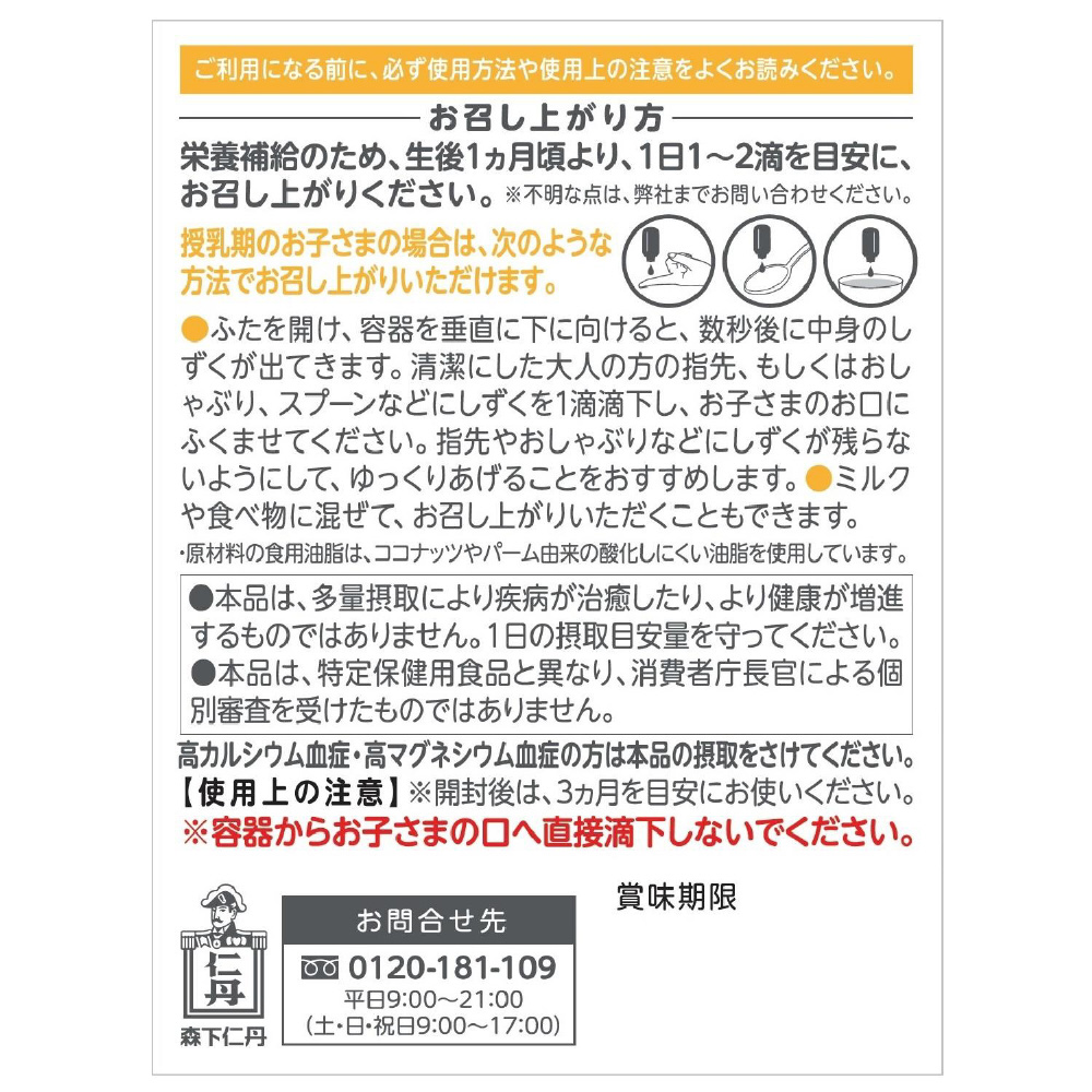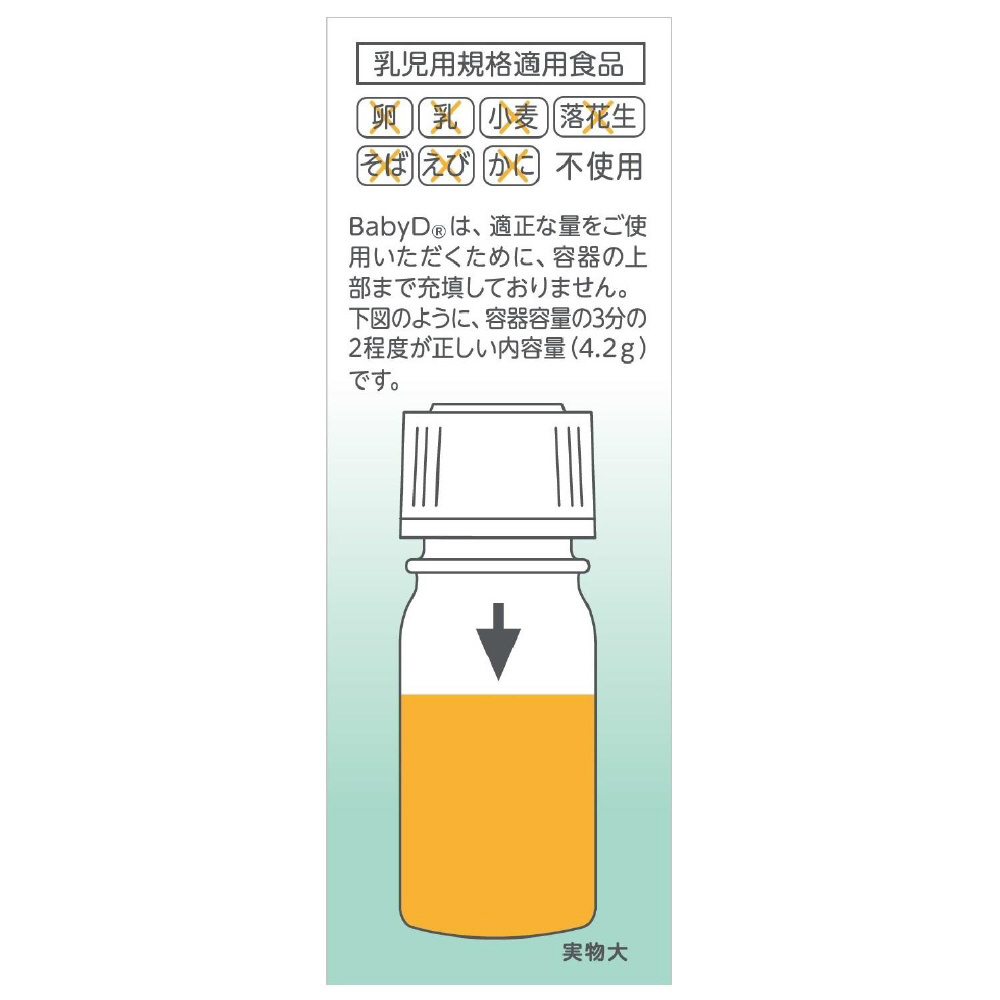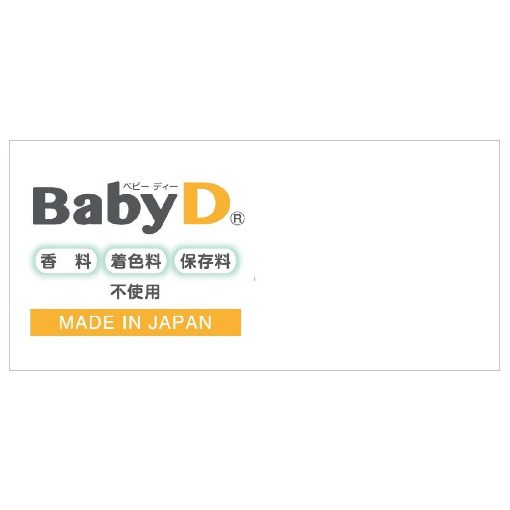 BabyDは紫外線対策や食物アレルギー対策などで不足しやすいビタミンDを手軽に補給できる、赤ちゃん(生後1か月)から使える液体の栄養機能食品(ビタミンD)です。赤ちゃんが食べても安心安全な素材だけで作っており、味もにおいもないので、いやがらずに食べてくれます。