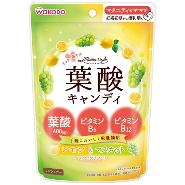 葉酸・ビタミンB6・ビタミンB12を配合したキャンディです。1日2粒で妊娠初期の必要分が補えます。レモンとマスカットの2つの味が楽しめます。