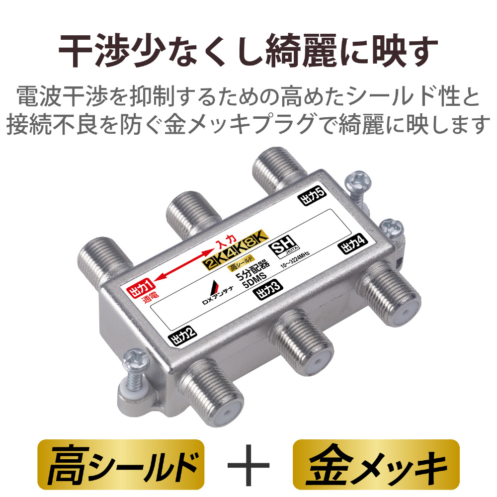 既存の2K放送から4K・8K(3224MHz)放送まで対応した製品です。屋内用6分配器です。テレビの電波を6つの系統に分けます。ノイズに強い高シールドダイキャスト構造。出力1端子から入力端子へ電源供給が可能。壁面取付用ビス付属。