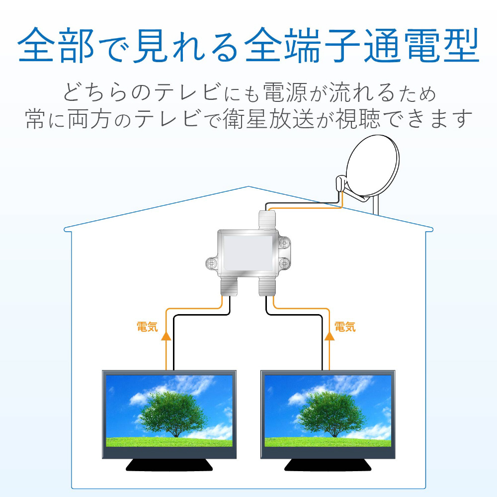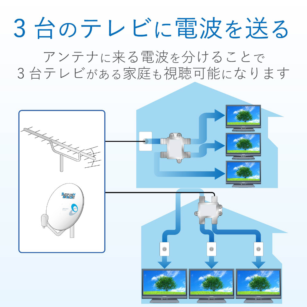 既存の2K放送から4K・8K(3224MHz)放送まで対応した製品です。テレビやレコーダーなどを増設する時に便利で、ノイズに強い3分配器。全ての出力端子から入力端子へ電源供給が可能で便利な全端子通電式。