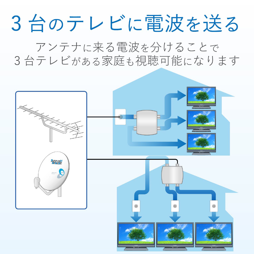 既存の2K放送から4K・8K(3224MHz)放送まで対応した製品です。テレビやレコーダーなどを増設する時に便利で、ノイズに強く、スッキリしたデザインの3分配器。全ての出力端子から入力端子へ電源供給が可能で便利な全端子通電式。