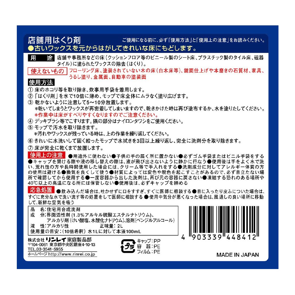 | 商品名 | リンレイ 店舗用はくり剤 化学床専用 2L |