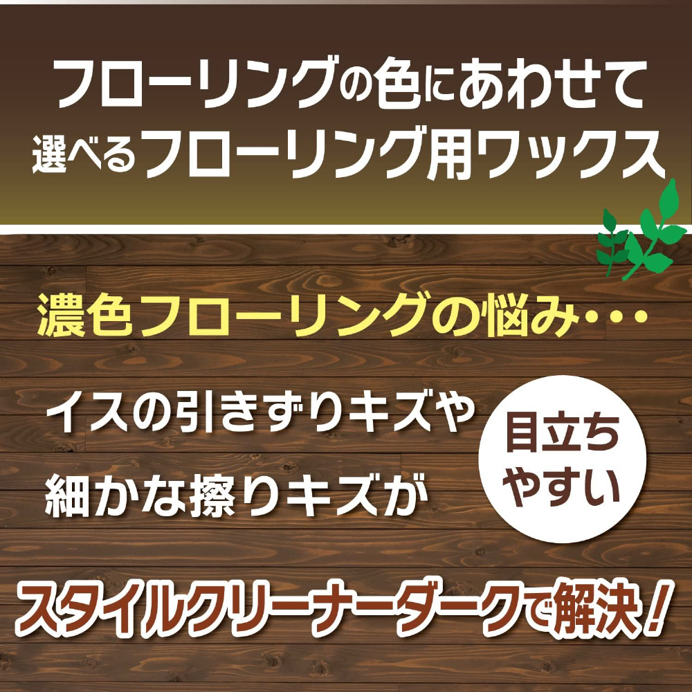 シックな濃色系のフローリング床向けのクリーナー。「細かなスリキズが目立ちやすい」濃色の床材ならではの悩みを解決。汚れ落とし性能はもちろん、特殊な樹脂が床の細かいスリキズを消して、新しいキズから床を守ります。また、スリキズが低減することで、床に深みのあるツヤが生まれます。