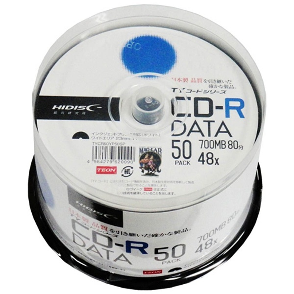【TYコードシリーズ】HIDISC CD-Rデータ用 48倍速 700MBホワイトワイドプリンタブルスピンドルケース 50枚 TYCR80YP50SP