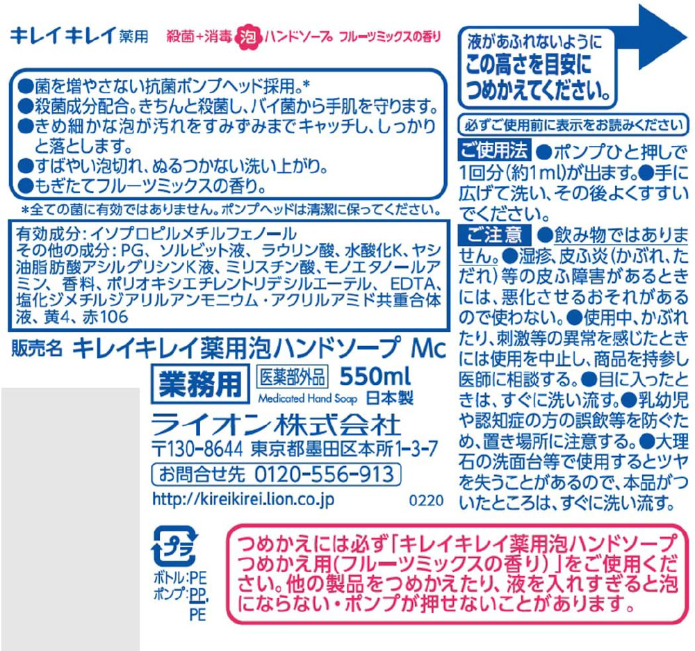 | 商品名 | キレイキレイ泡ハンドソープフルーツミックス550ml |