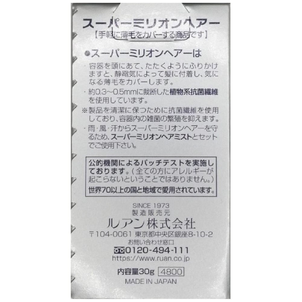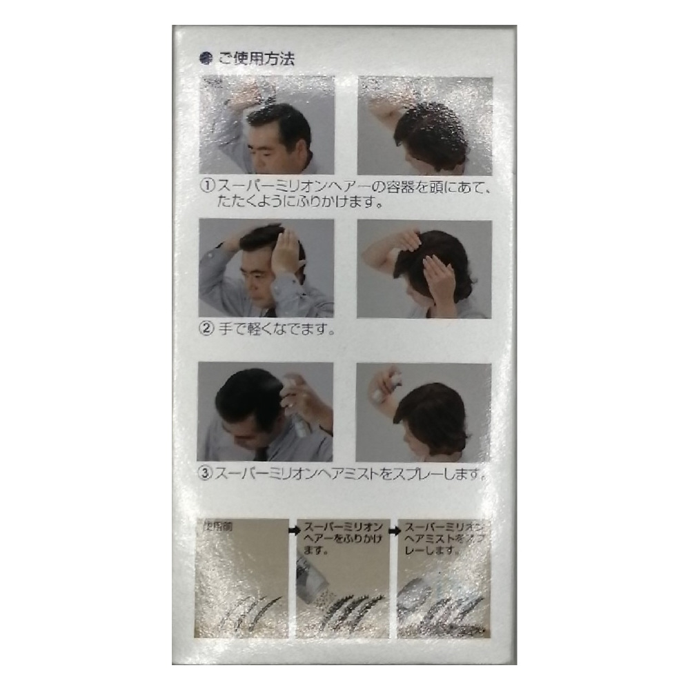 スーパーミリオンヘアーは特殊加工された人工毛(約0.3〜0.5mmに裁断した繊維)です。ふりかけると静電気により髪に付着し、気になる薄毛をカバーします。