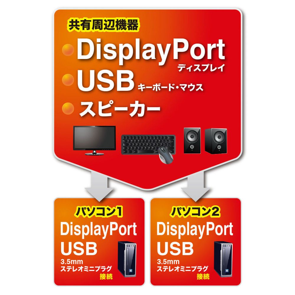 DisplayPortディスプレイ・USBキーボード・USBマウスに対応したKVM切替器。手元切替スイッチ付きでDisplayPort切替器としても使用可能。