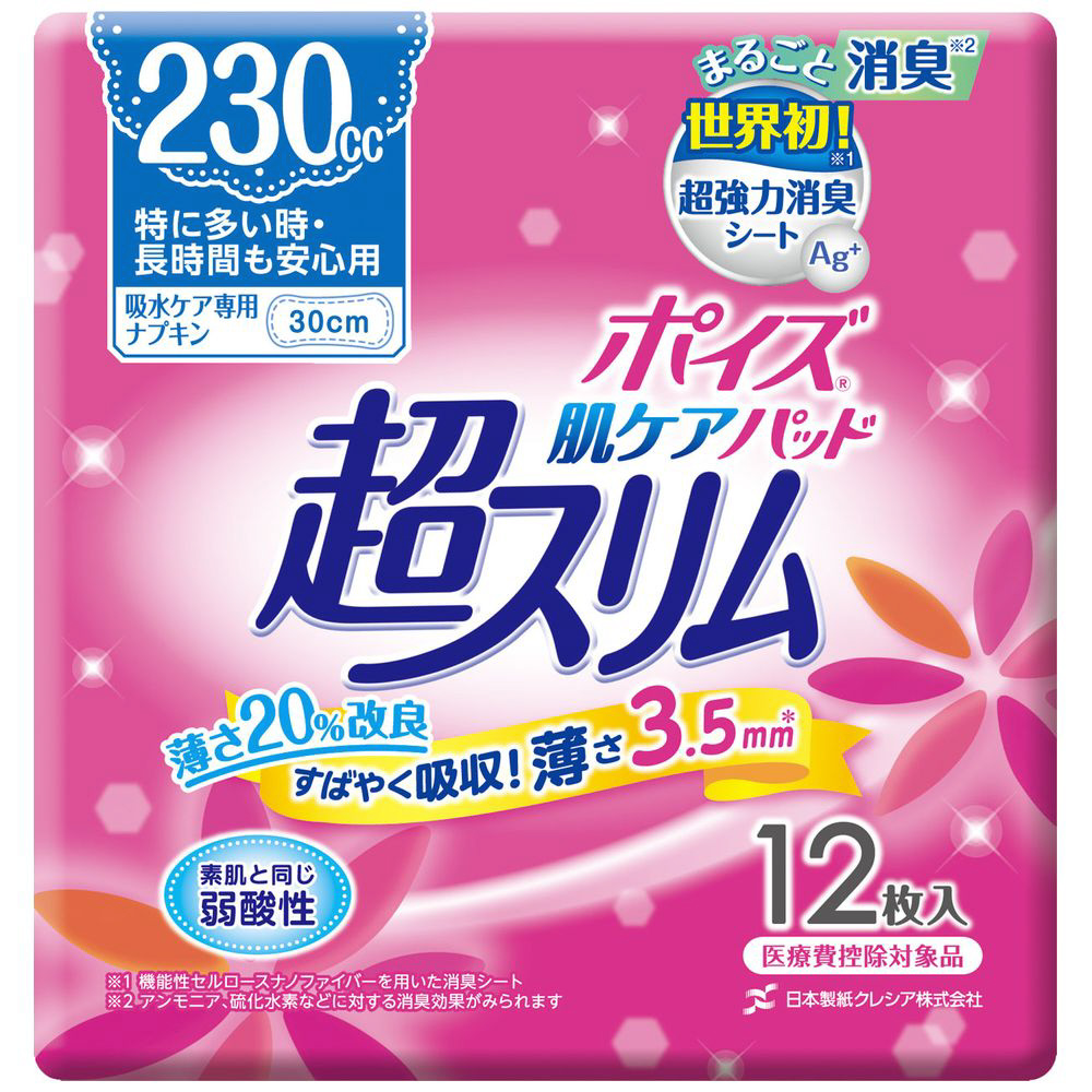 ●世界初!機能性セルロースナノファイバーを用いた抗菌効果のある超強力消臭シートで気になるニオイも安心●高吸収ポリマーシートで薄いのにすばやく吸収●お肌にやさしい素肌と同じ弱酸性のやわらかシート●横モレ防止立体ギャザー●かわいい花柄エンボスつき●ムレにくい全面通気性 パッド薄さ:3.5mm パッドサイズ:10.5×30cm 吸収量の目安:230cc