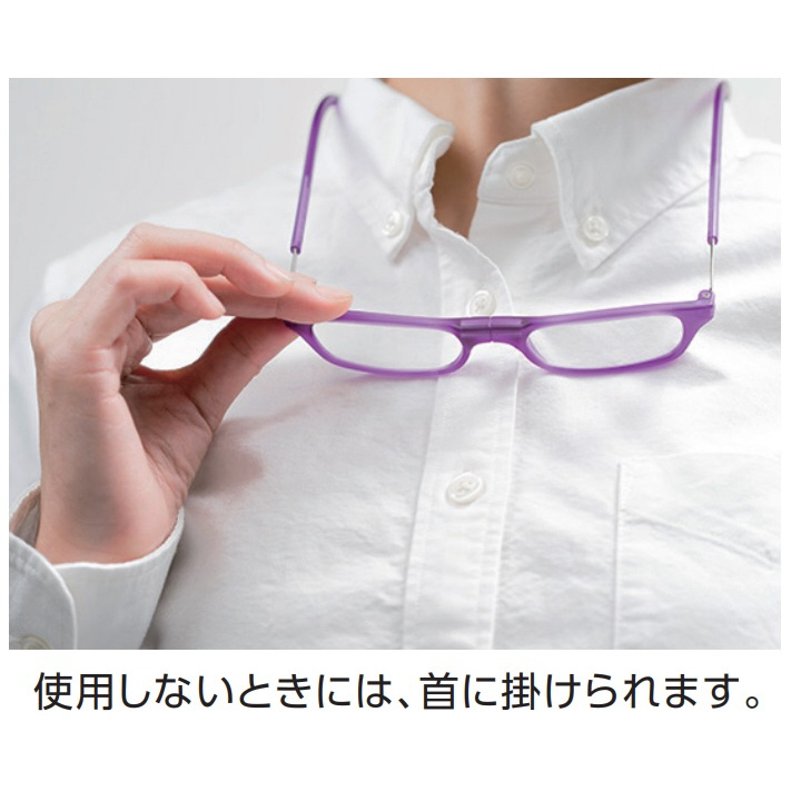 フロントのマグネットで簡単着脱。使うときにさっとかけ、外したらそのまま肩にかけられる。ツルの長さが調整可能な老眼鏡です。