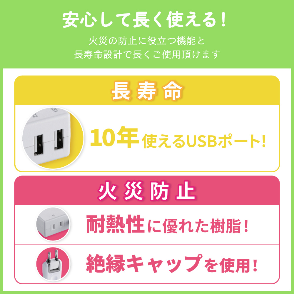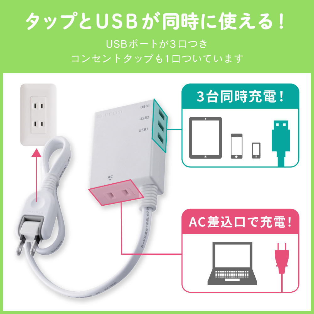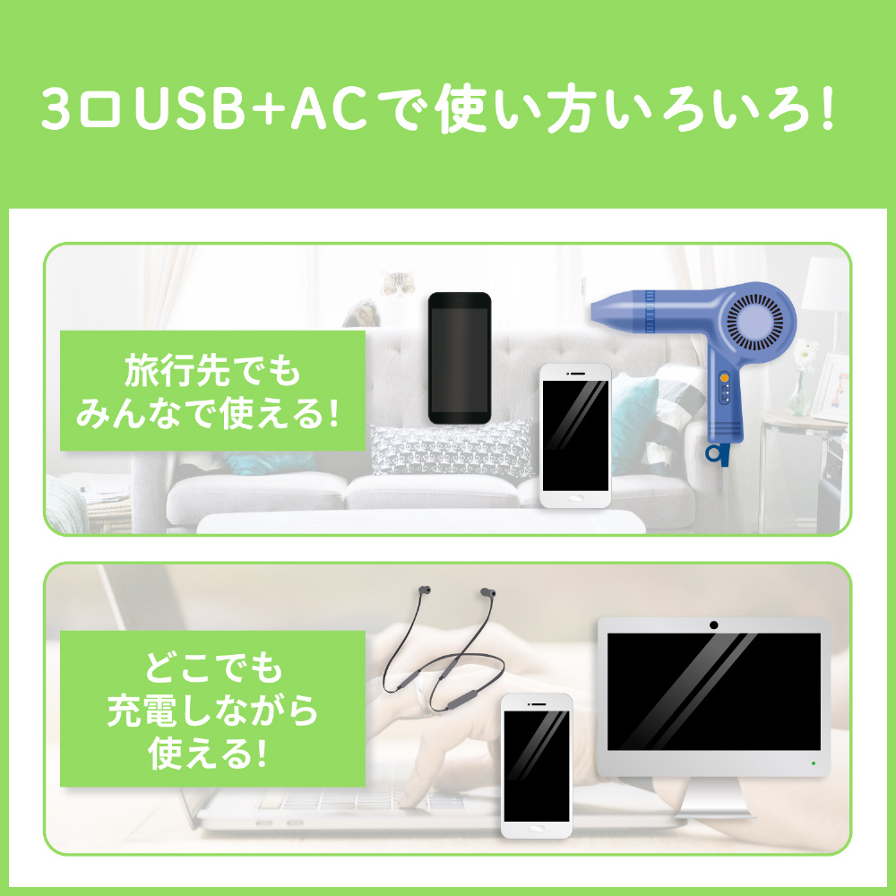 ACタップとUSBポートが一体になった、アダプタなしで簡単にパソコンやスマホ、タブレットを充電できるモバイルUSBタップ。