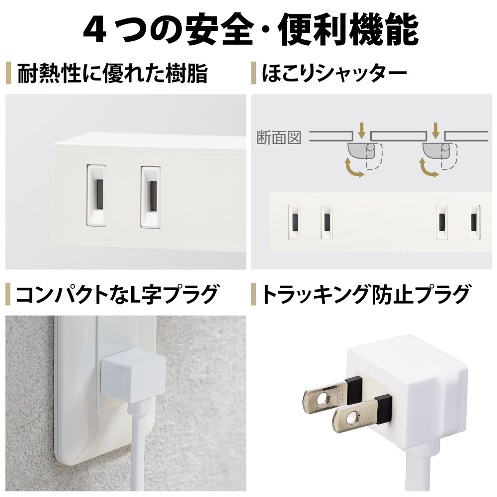 | 仕様2 | ■二重被ふく:○ ■カラー:ホワイト(白) ■材質:本体:ABS樹脂、プラグ:PVC 差込口:ユリア樹脂 ■外形寸法:幅28mm×奥行150mm×高さ23mm ※コード部分及びプラグ部分を除く ■質量:約223g ■使用可能地域:本製品は日本国内の電源を想定して設計されていますので、日本国外ではご使用いただけません。 ■電気用品安全法:PSE適合 |