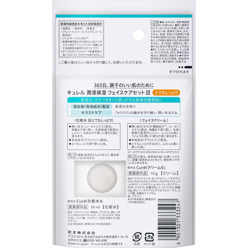 肌荒れやカサつきをくり返しがちな乾燥性敏感肌に。旅先や外出先でもキュレルの潤浸保湿をお使いいただける化粧水とフェイスクリームのセット。『セラミドケア』で「セラミド」の働きを効果的に補い、肌に潤いを与え、肌荒れしにくいふっくらと潤いに満ちた肌に保ちます。肌荒れを防ぎます。消炎剤配合。・化粧水30ml・フェイスクリーム10g・無香料・無着色・アルコールフリー(エチルアルコール無添加)(医薬部外品)