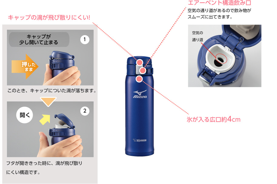・片手でラクラク操作ができるので、 手軽に素早く水分補給ができます。