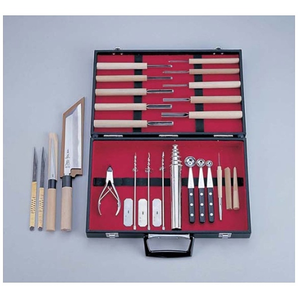 季節の宴料理づくりに、必要不可欠な小道具。サイズはケースサイズです。セット内容:切出し3分(直)、切出し3分(曲)、繰小刀(大)、ムキモノ庖丁(サヤ付)/本霞玉白鋼、坪錐(10本組)丸(0.5分・1分・1.5分・2分・2.5分・3分・3.5分)角(1分・2分・3分)、ムキモノ用ニッパー、タズナ抜き(3本組)、筒抜6本組、繰抜(大・中・小)、極細錐、坪錐用砥石角、坪錐用砥石丸、ムキモノ用ケース