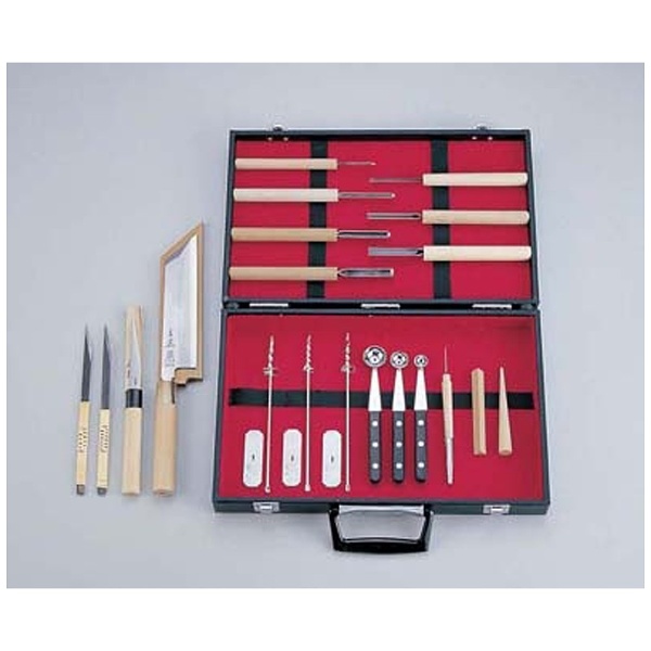 ■セット内容:ムキモノ庖丁(サヤ付)、坪錐(7本組) 丸(0.5分・1.5分・2.5分・3.5分) 角(1分・2分・3分)、タズナ抜(3本組)、切出し3分(直)、切出し3分(曲)、繰ヌキ(大・中・小)、極細錐、繰小刀(小)、坪錐用砥石角、坪錐用砥石丸、ムキモノ用ケース