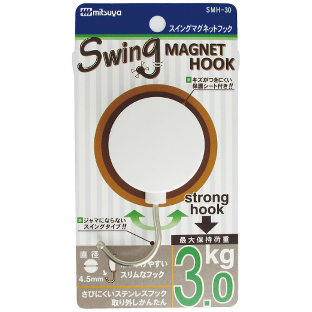 耐荷重約3kgのマグネットフック。フック部分が左右にスイング、収納できるので未使用時邪魔になりません。磁着面に傷防止フィルム貼合しています。