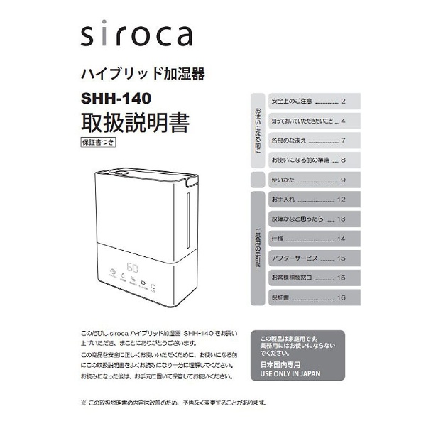siroca ハイブリッド加湿器 SHH-140取扱説明書です。※こちらは加湿器ではございません。加湿器の「取扱説明書」です。