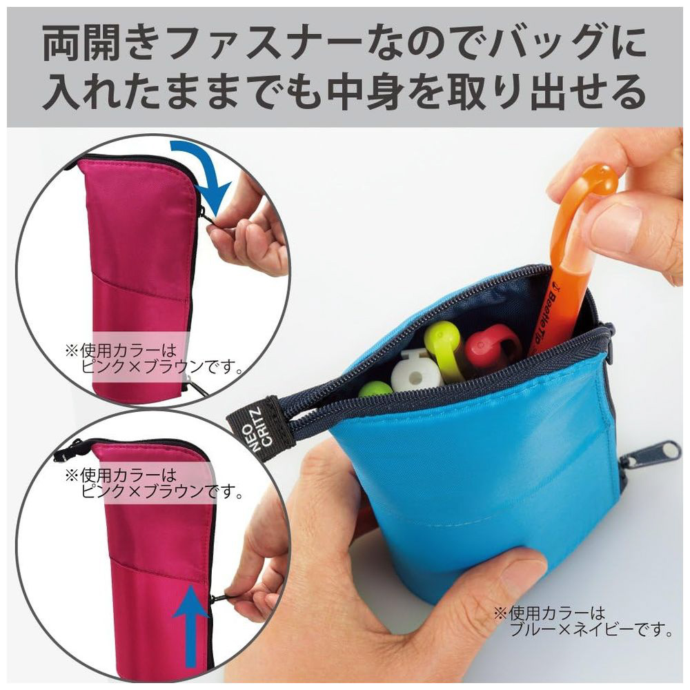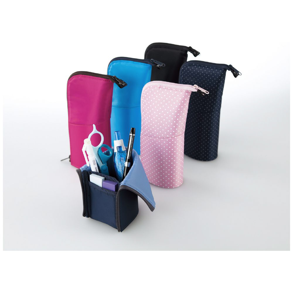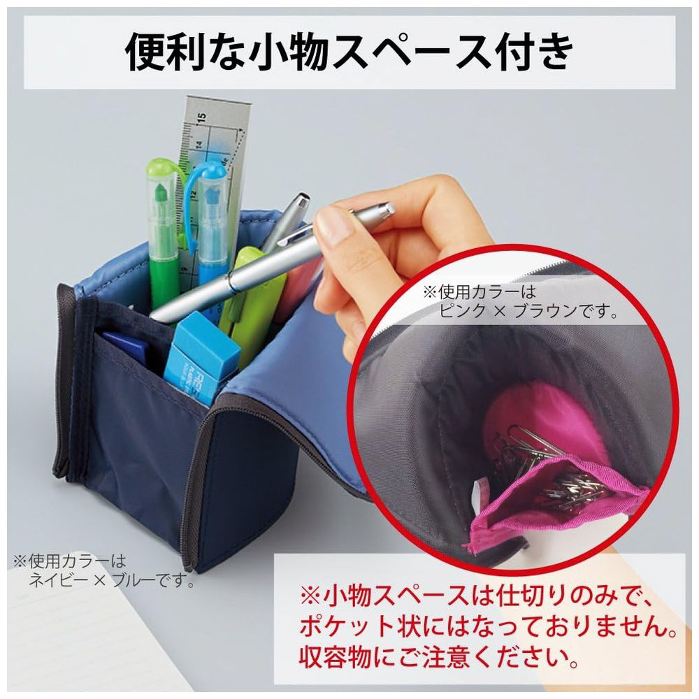 ●ファスナーを開けて上半分を折り返せば、ペンスタンドに早変わり。取り出しやすいうえに、机上の省スペースにもつながります。